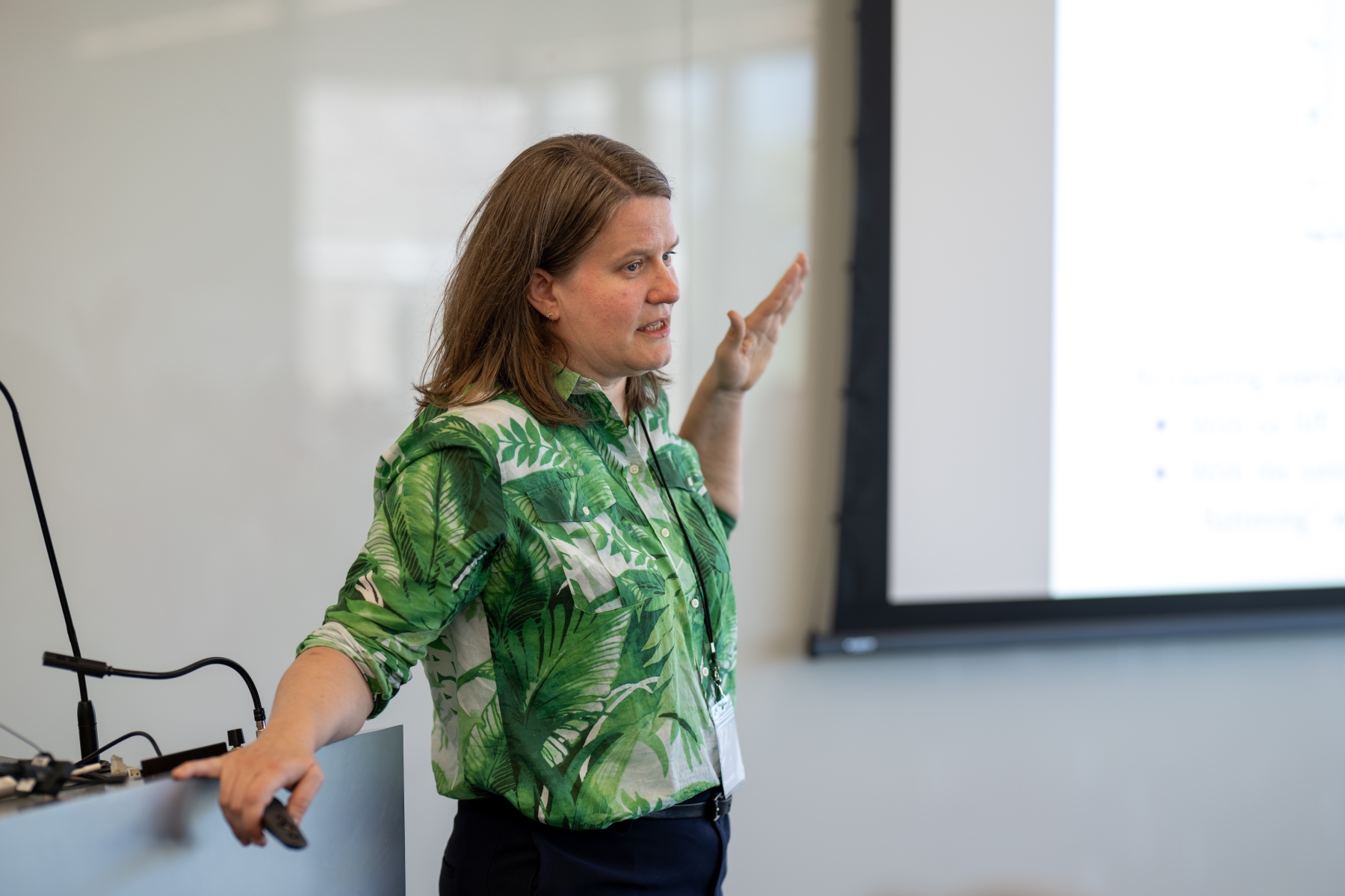 Pol Antràs (Harvard) presents during a session on global value chains and trade in tasks.