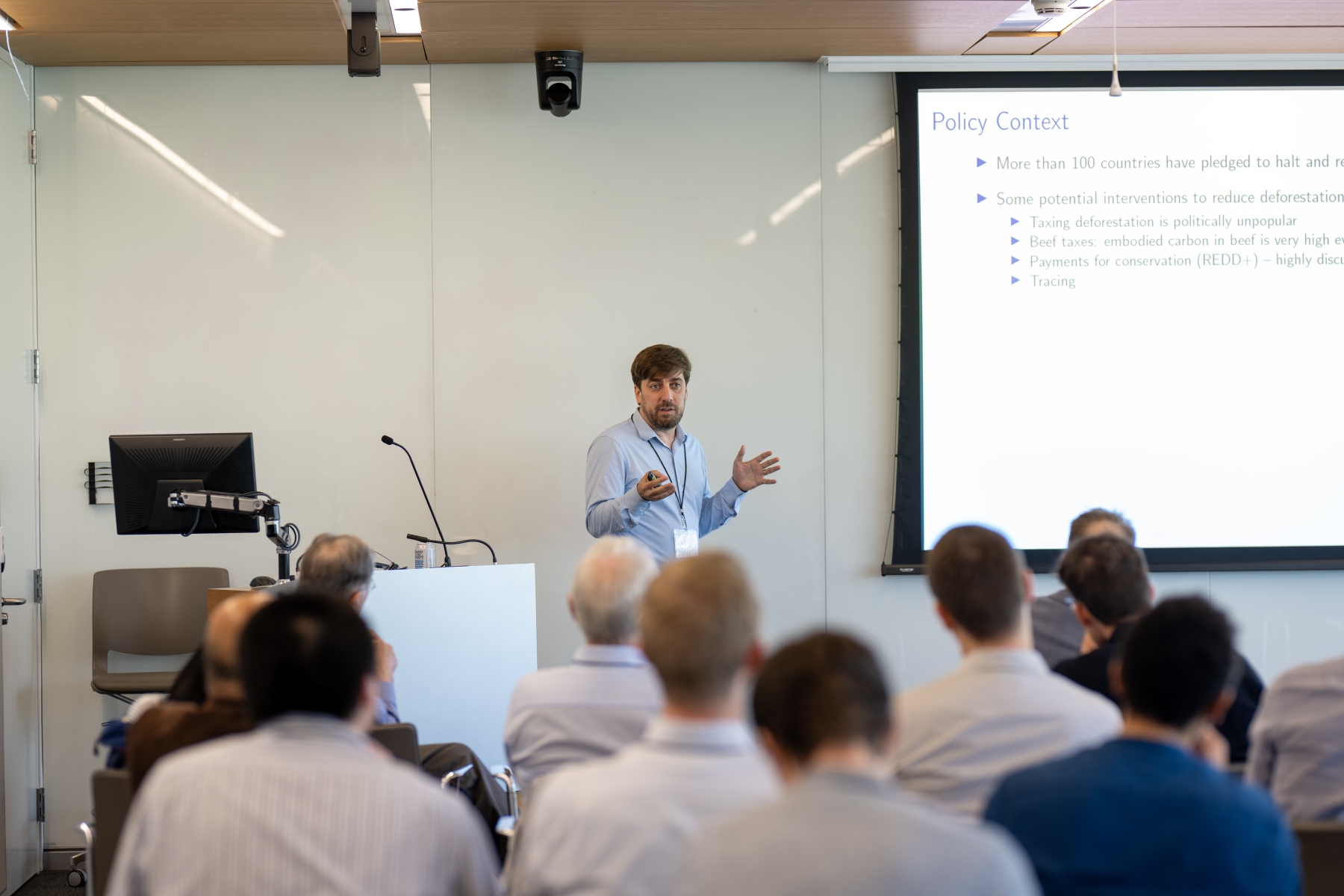 Pol Antràs (Harvard) presents during a session on global value chains and trade in tasks.