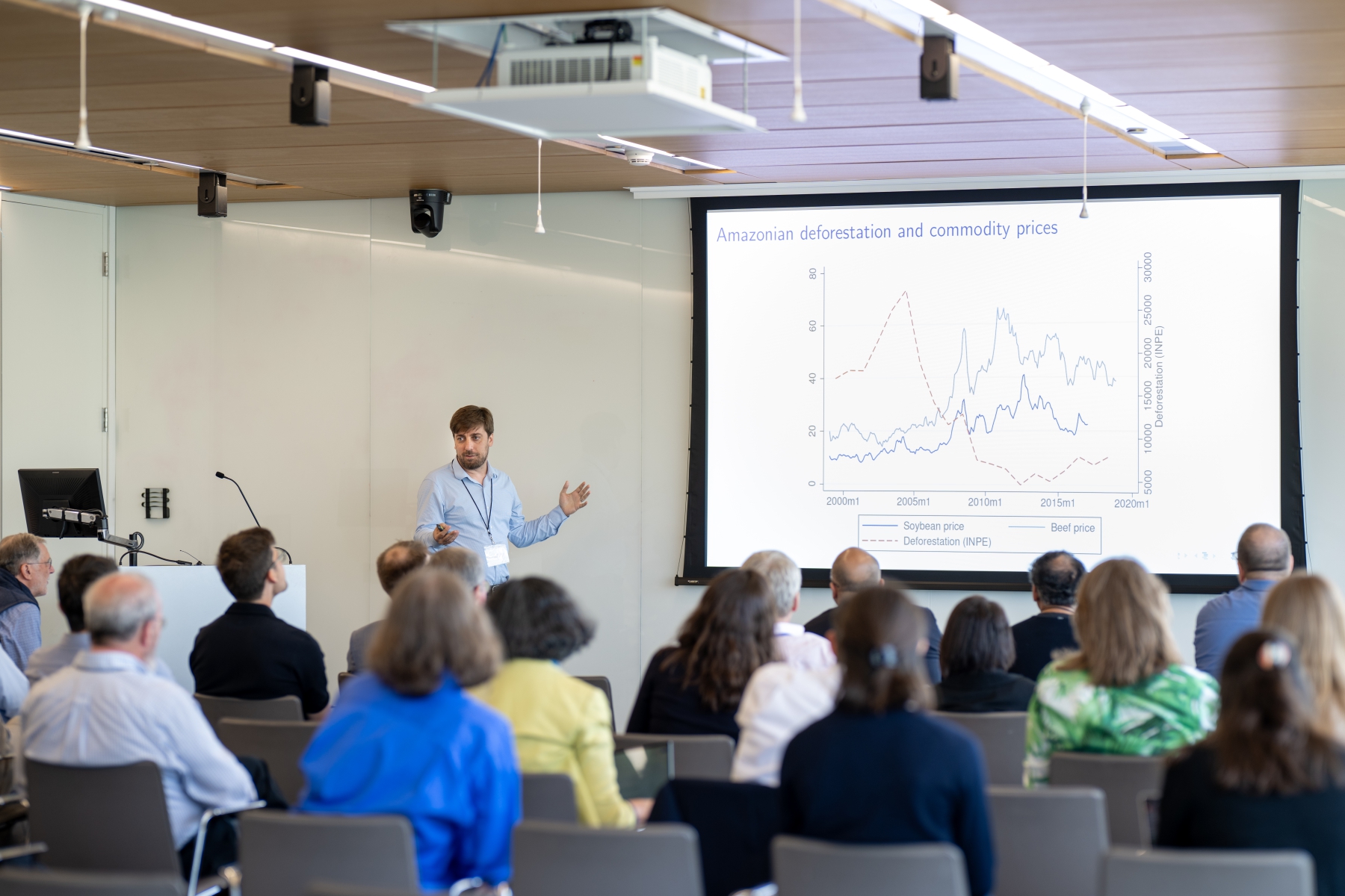 Pol Antràs (Harvard) presents during a session on global value chains and trade in tasks.