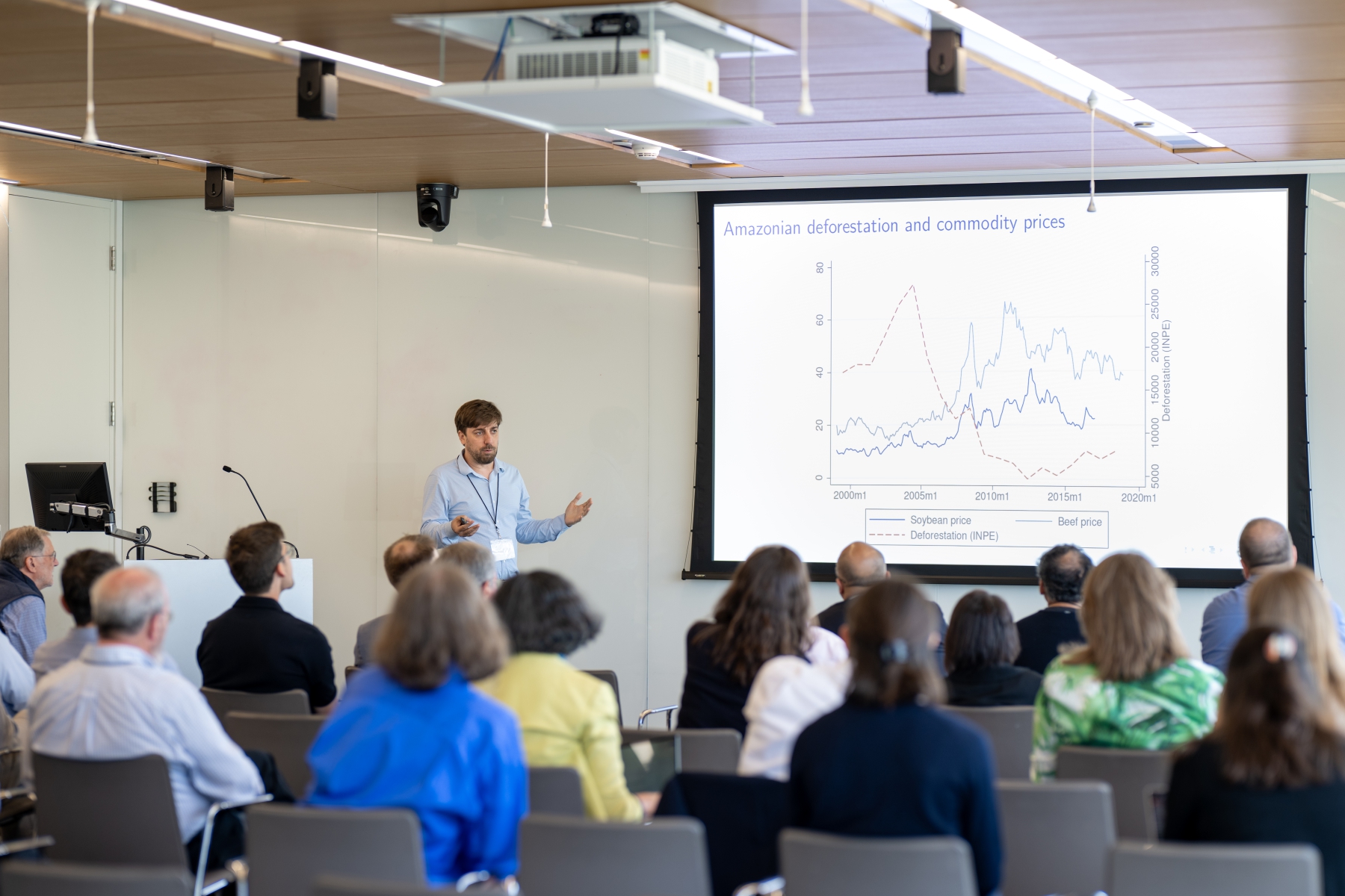 Pol Antràs (Harvard) presents during a session on global value chains and trade in tasks.