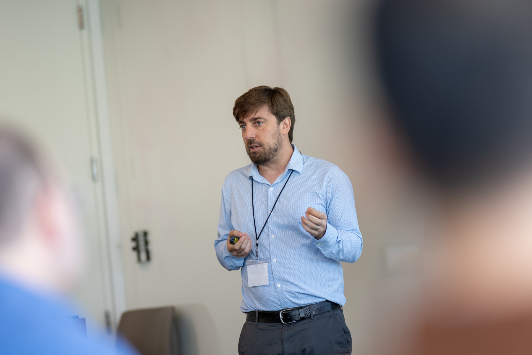 Pol Antràs (Harvard) presents during a session on global value chains and trade in tasks.