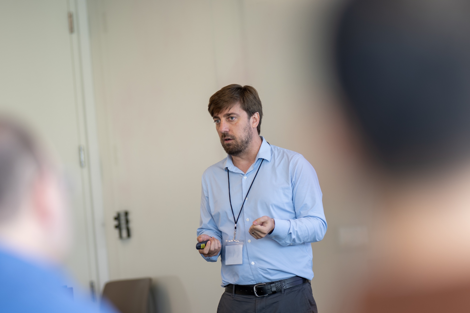 Pol Antràs (Harvard) presents during a session on global value chains and trade in tasks.