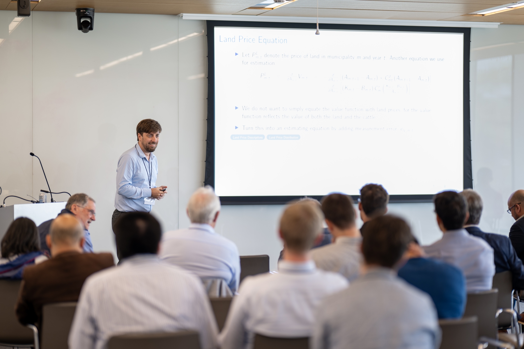 Pol Antràs (Harvard) presents during a session on global value chains and trade in tasks.